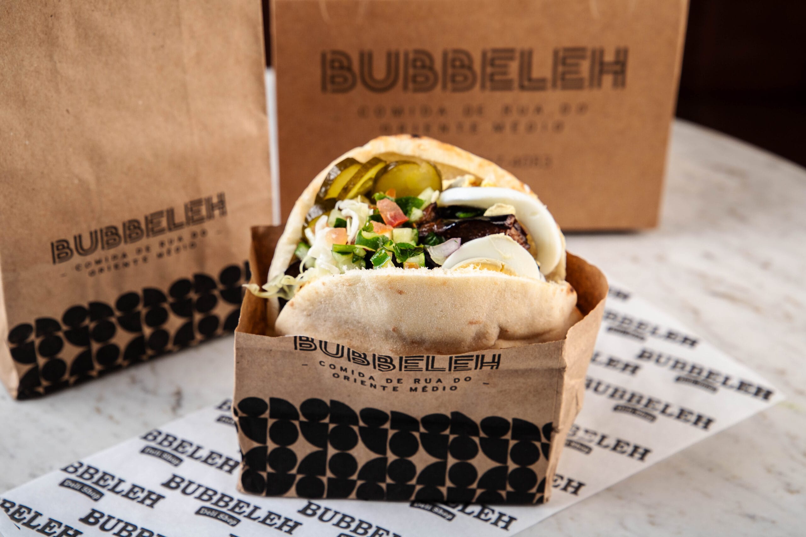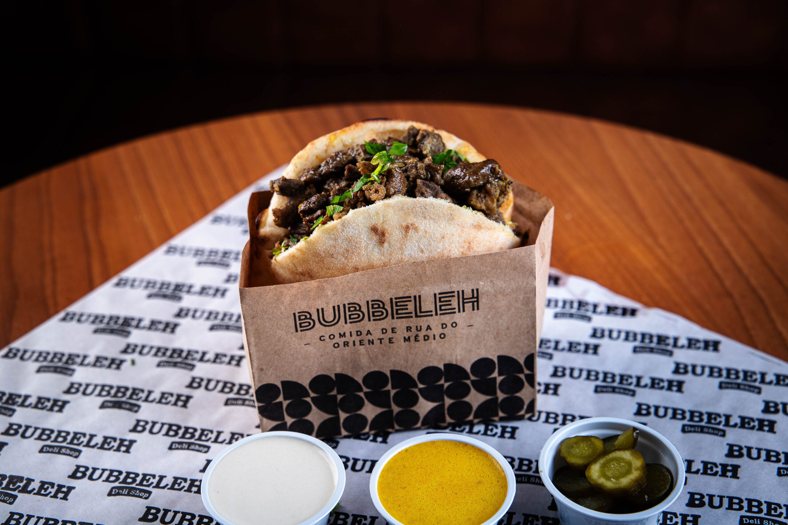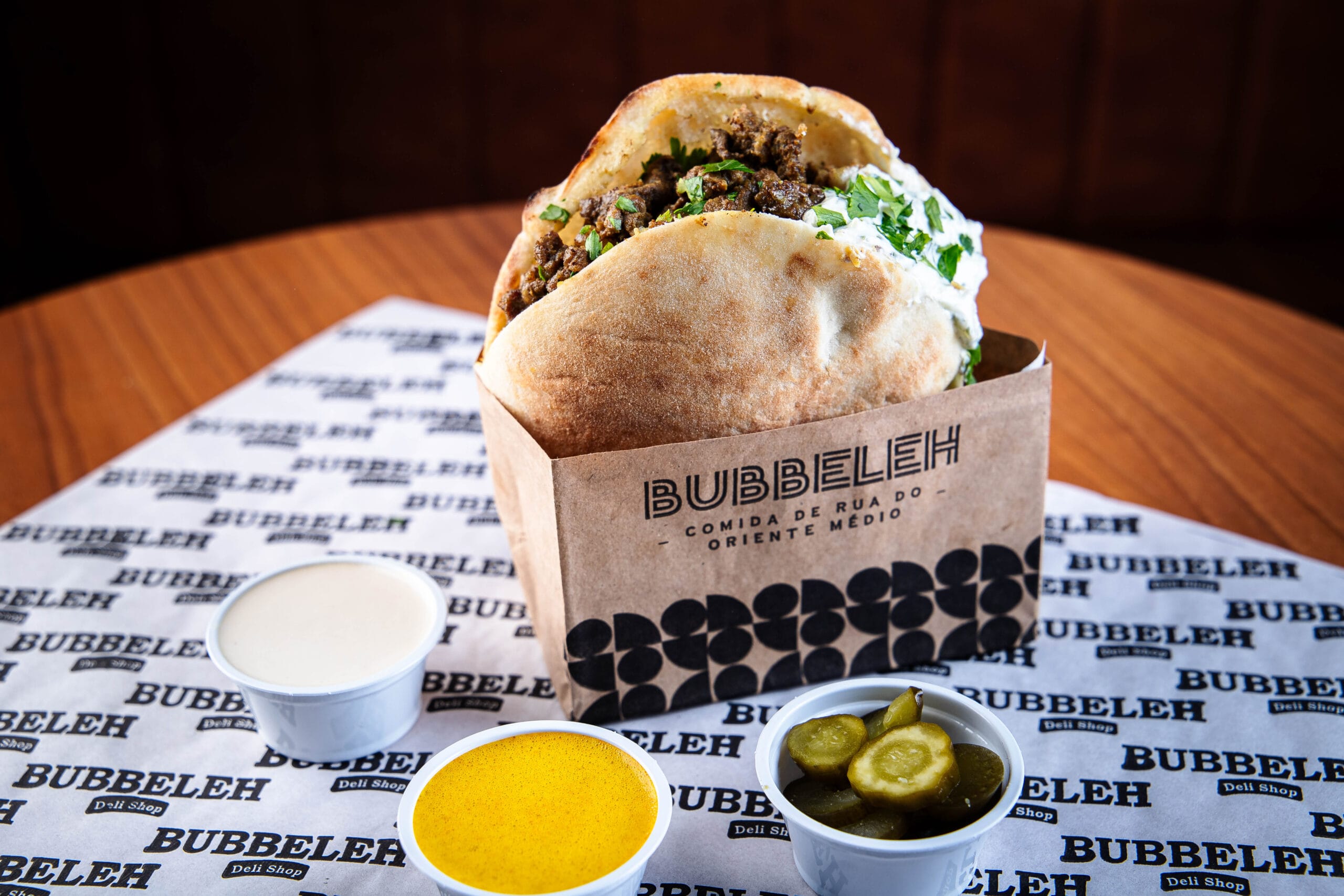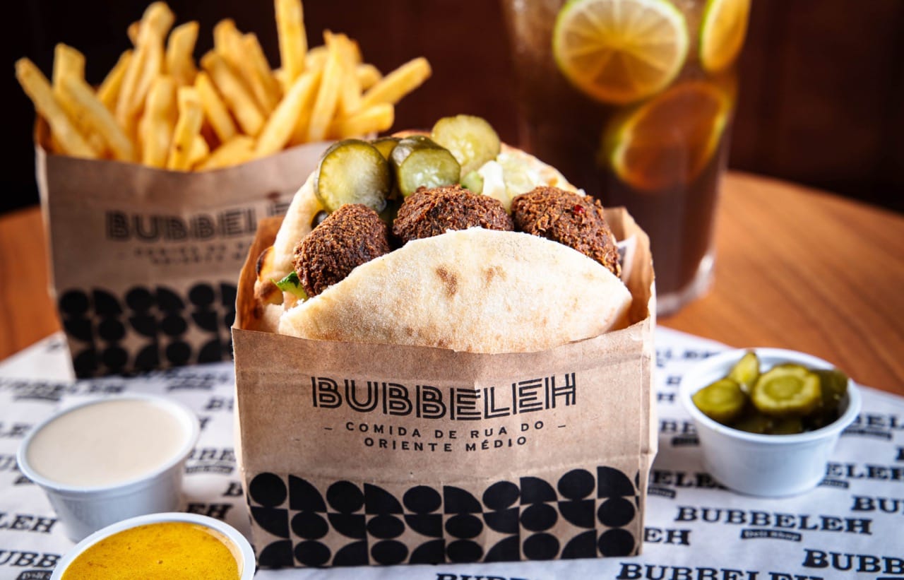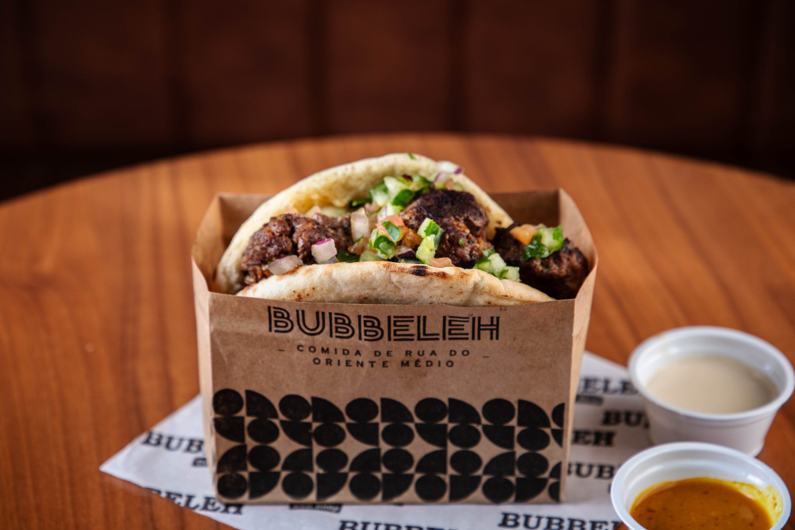 Lanche é servido no pão pita ou folha, acompanha homus, tahine, pimenta, carne, salada israelense (tomate, pepino japonês, cebola roxa e salsa).