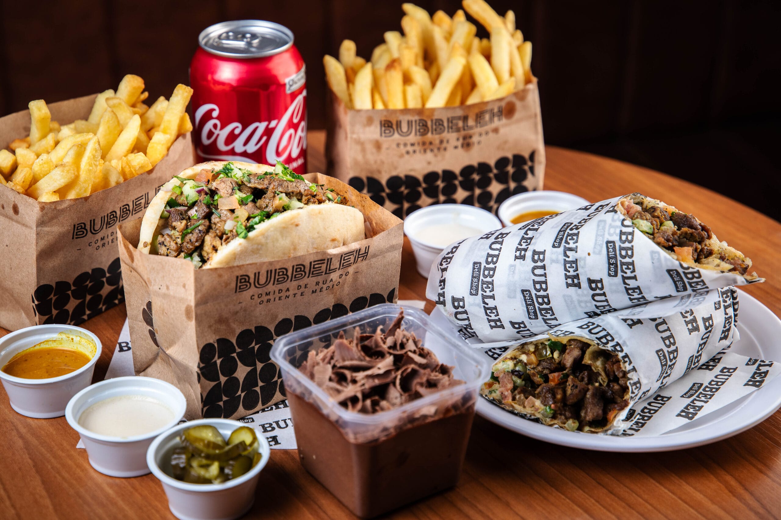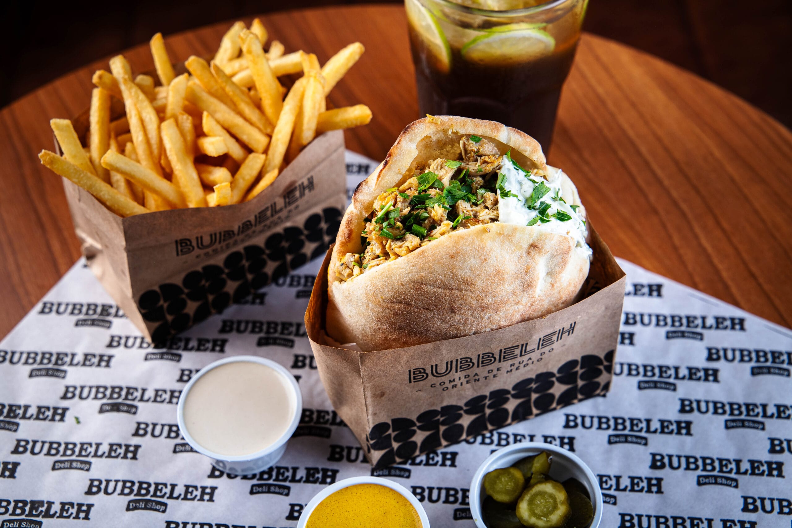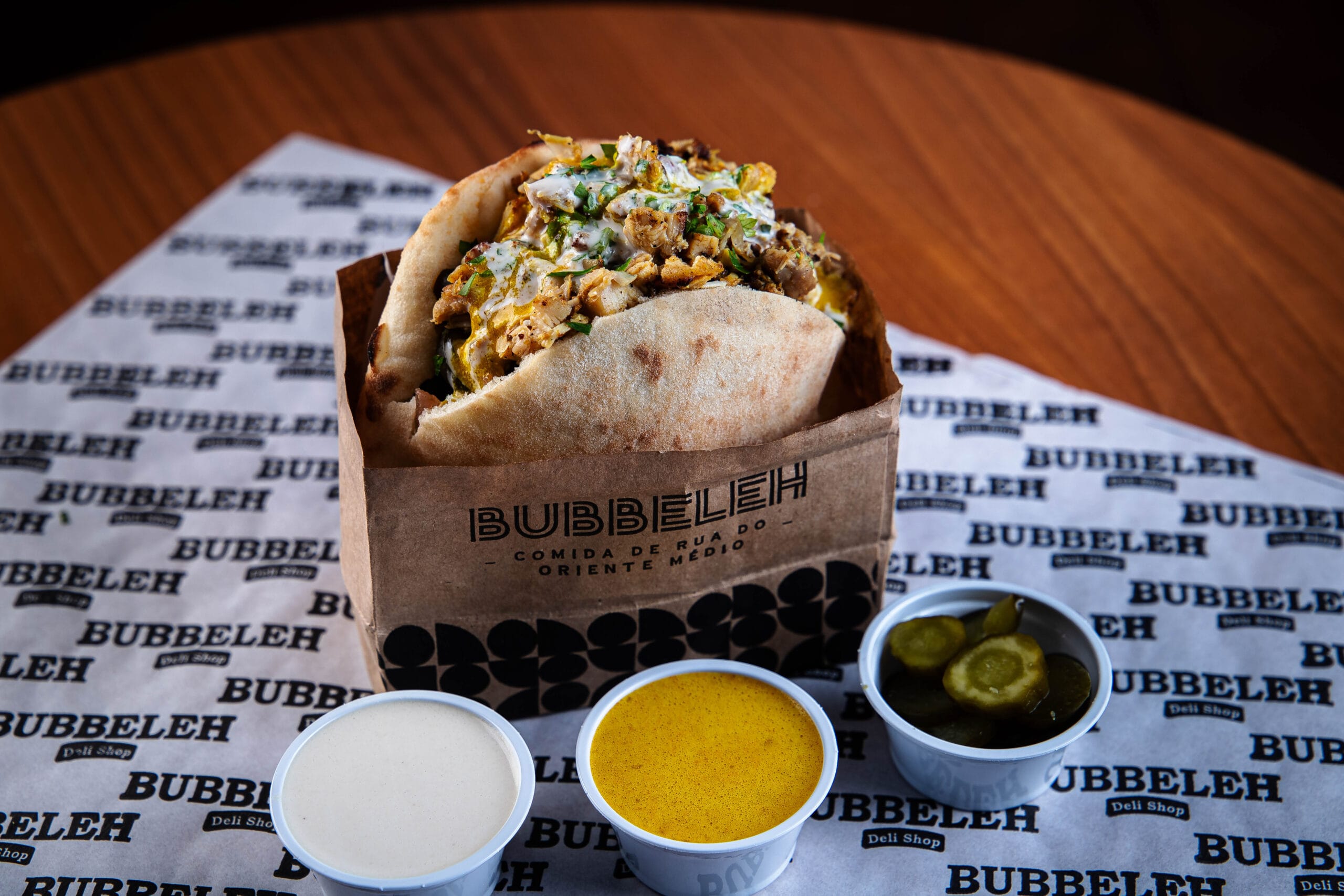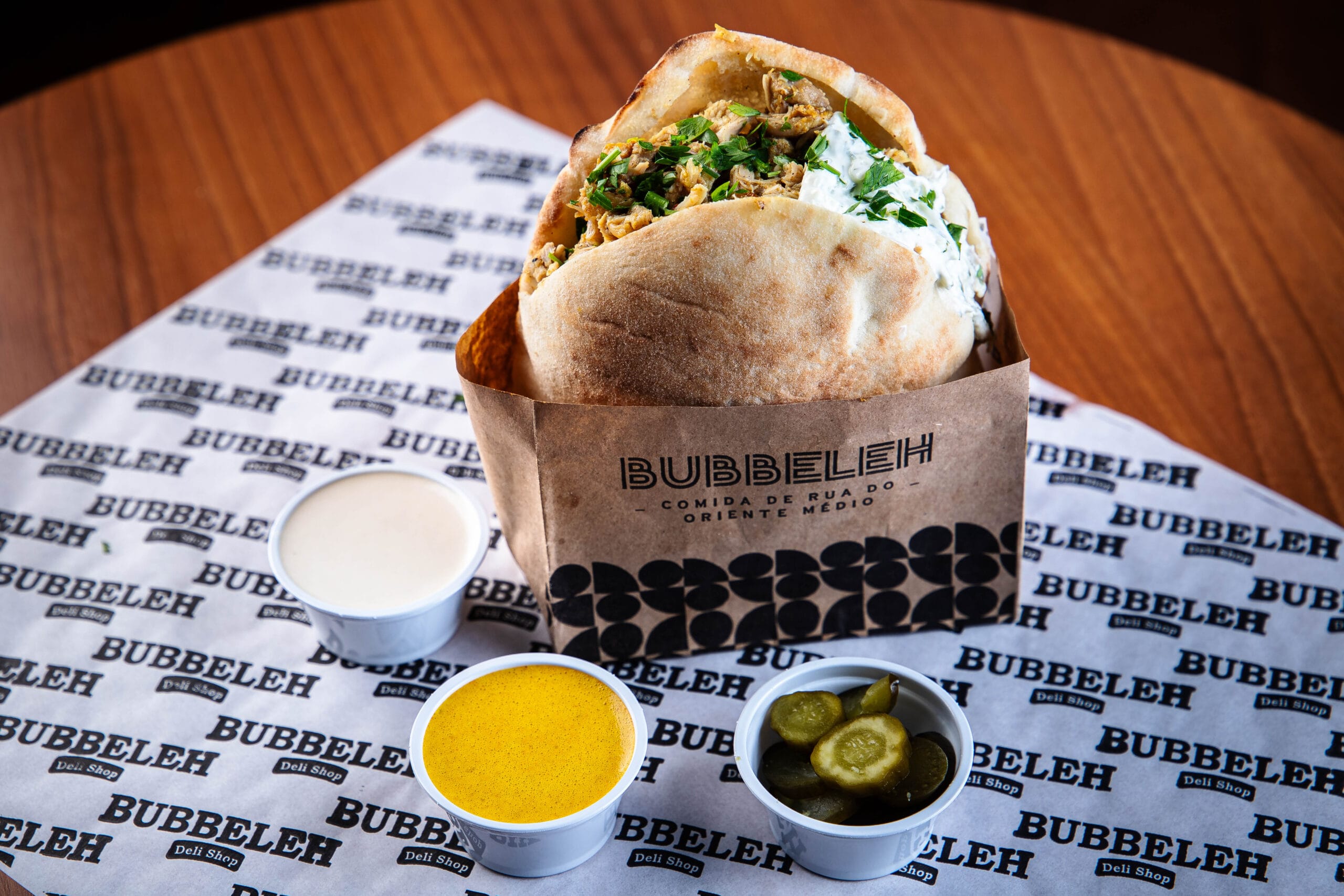 Lanche é servido no pão pita ou folha, acompanha homus, tahine, pimenta, carne, salada israelense (tomate, pepino japonês, cebola roxa e salsa).