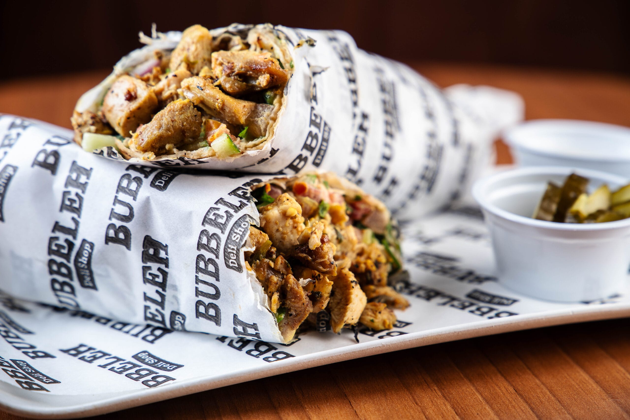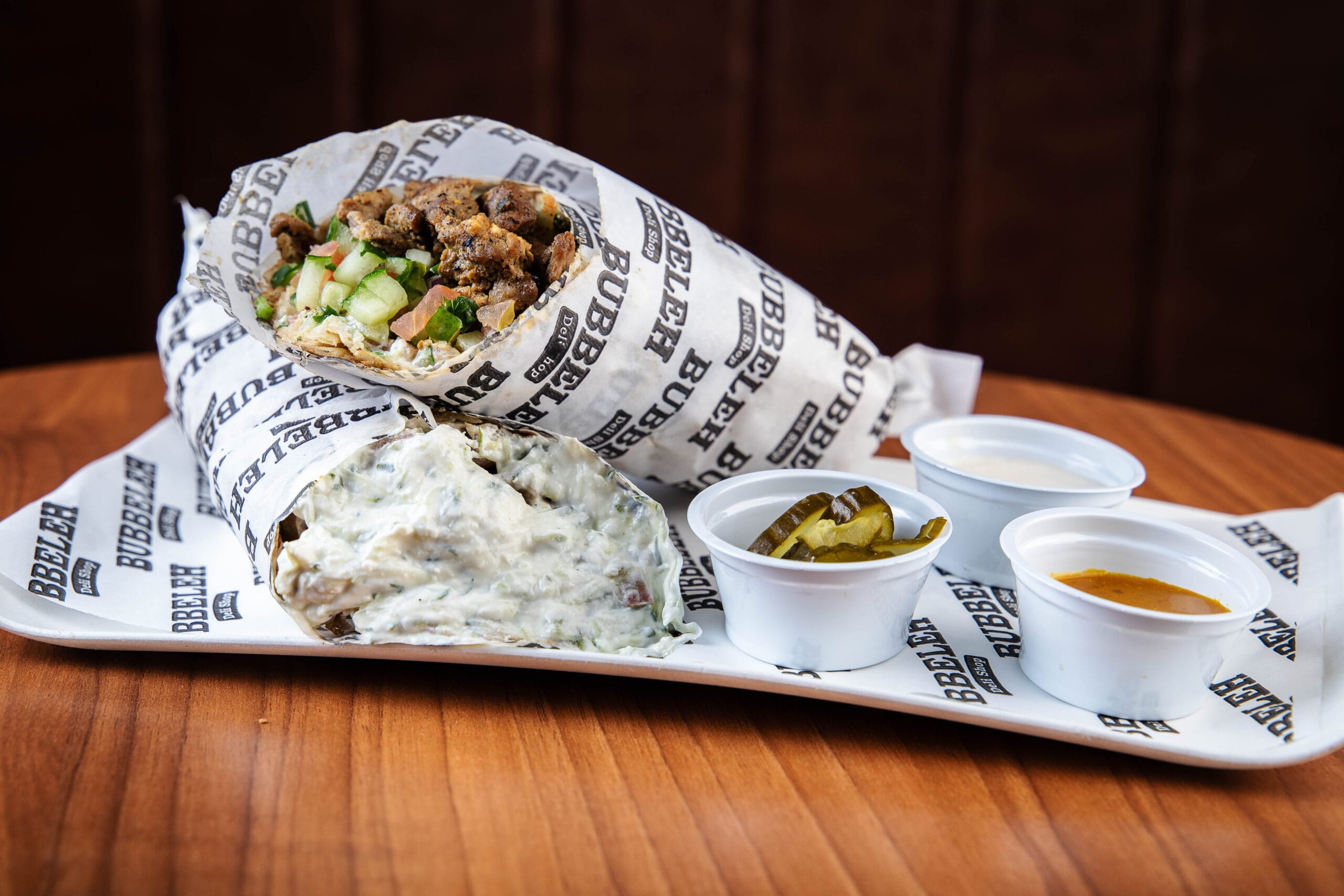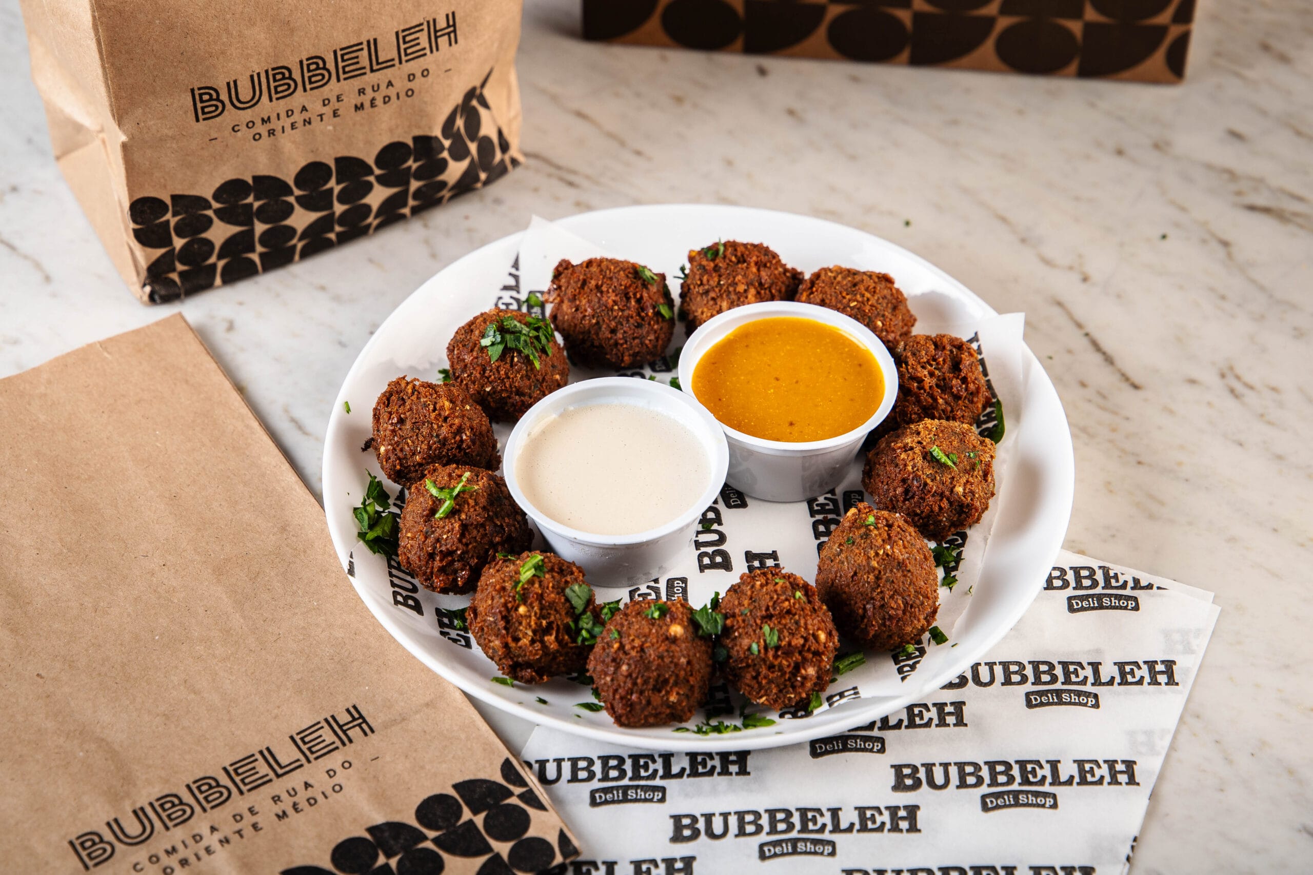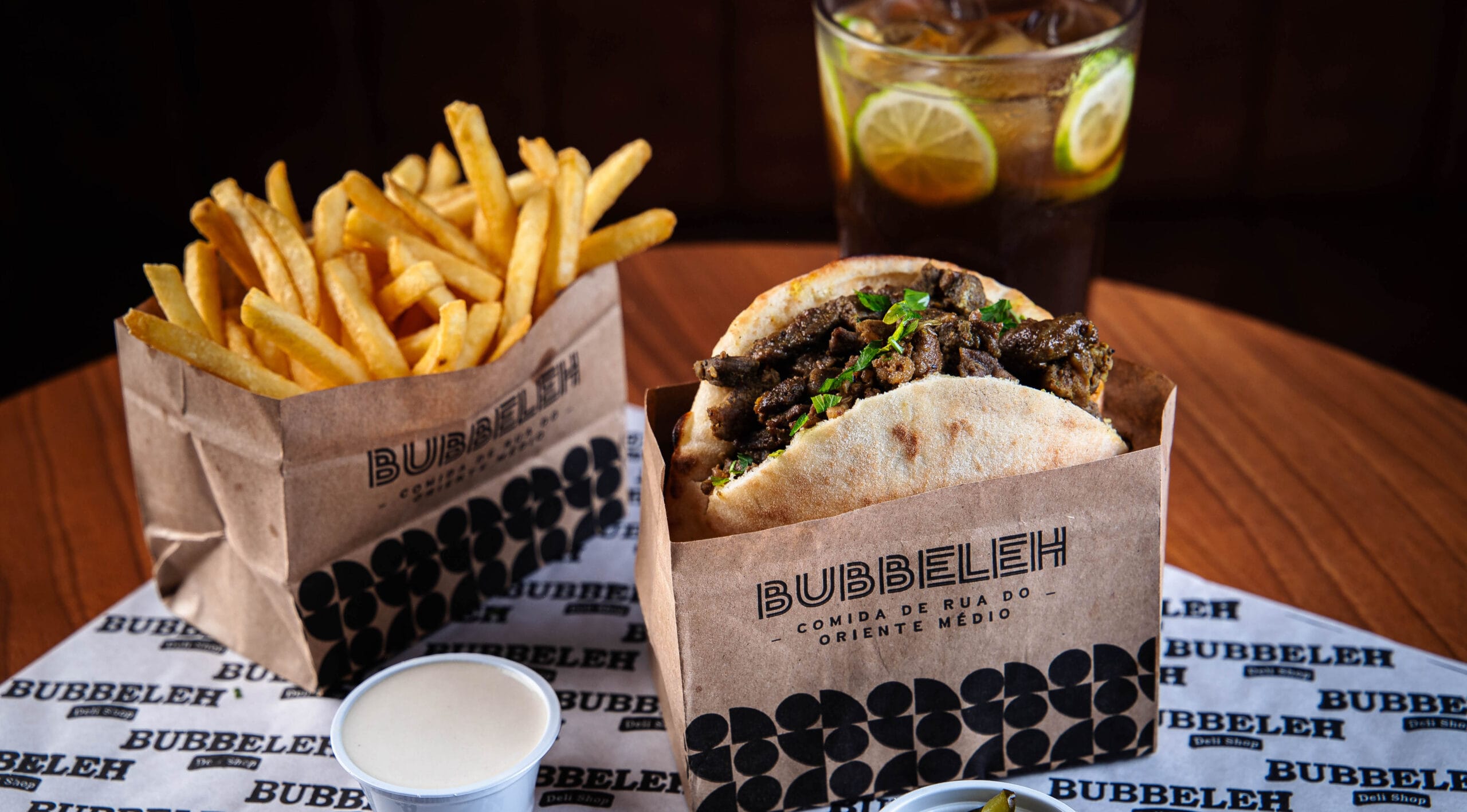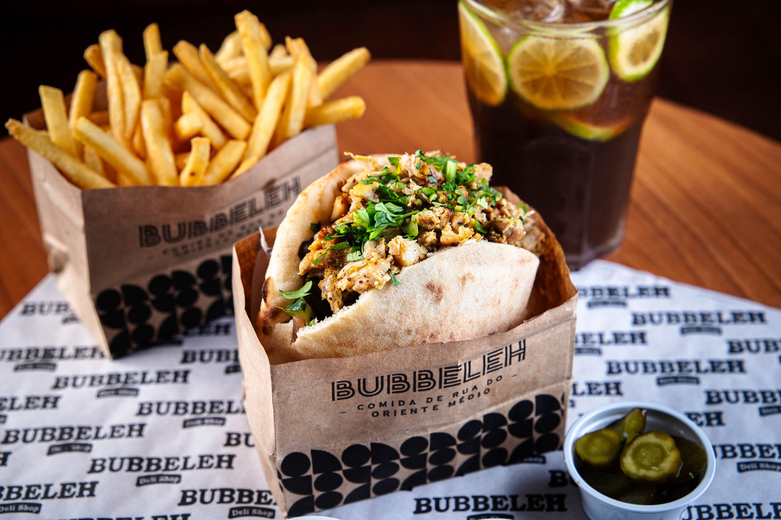 Lanche é servido no pão pita ou folha, acompanha homus, tahine, pimenta, carne, salada israelense (tomate, pepino japonês, cebola roxa e salsa).