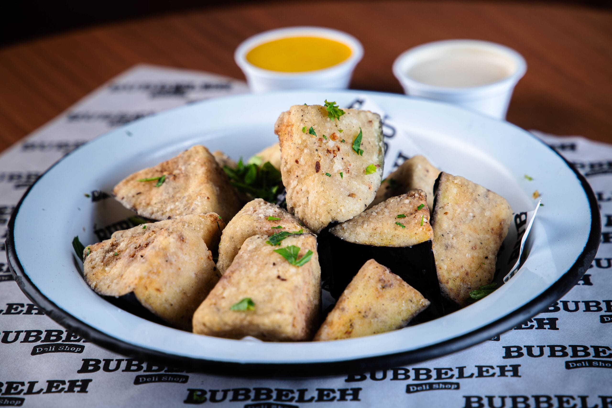 170g de Berinjela e acompanha um molho tahine, ou um molho de coalhada..