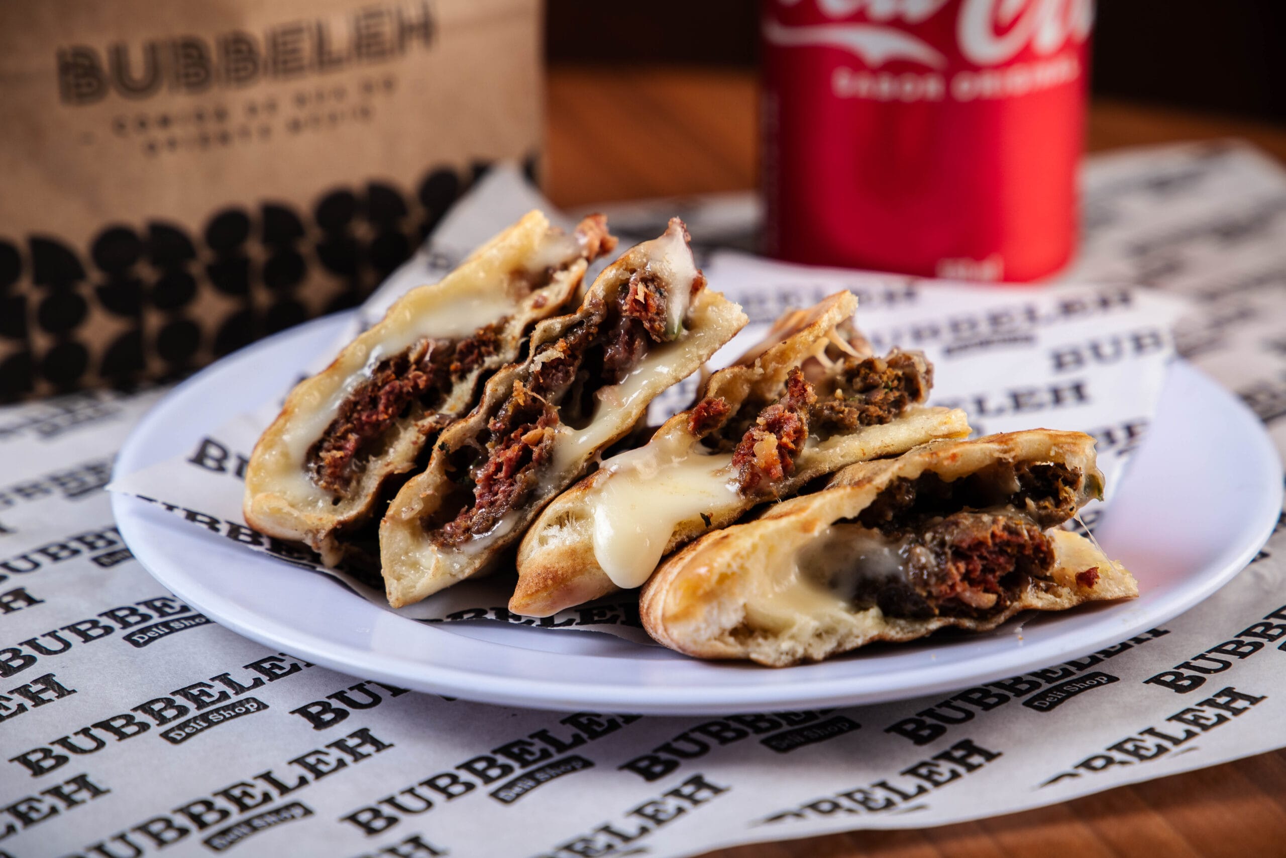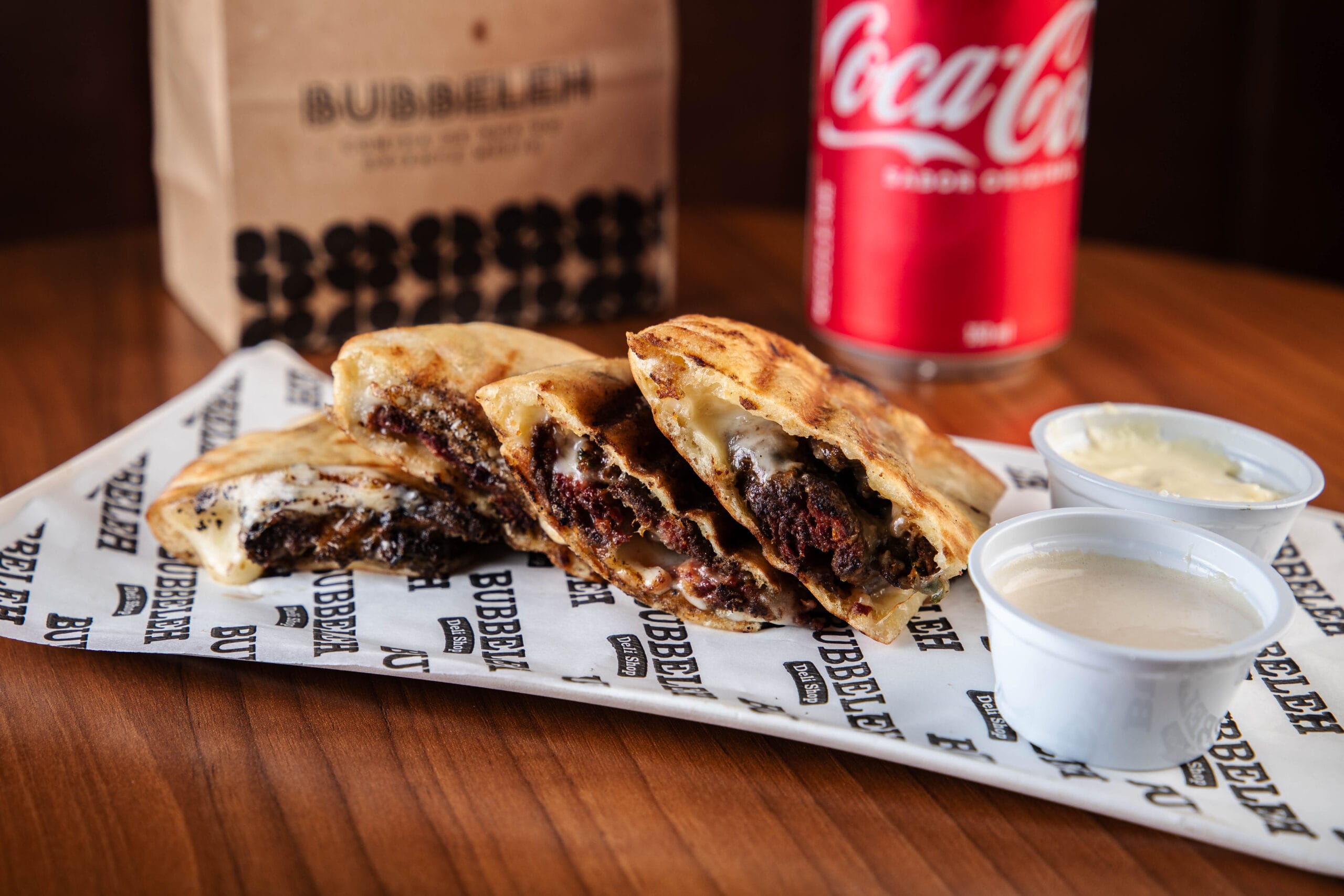 Pão pita tostada, recheado com carne, queijo meia cura e especiarias, acompanha aioli, picles e tahine.