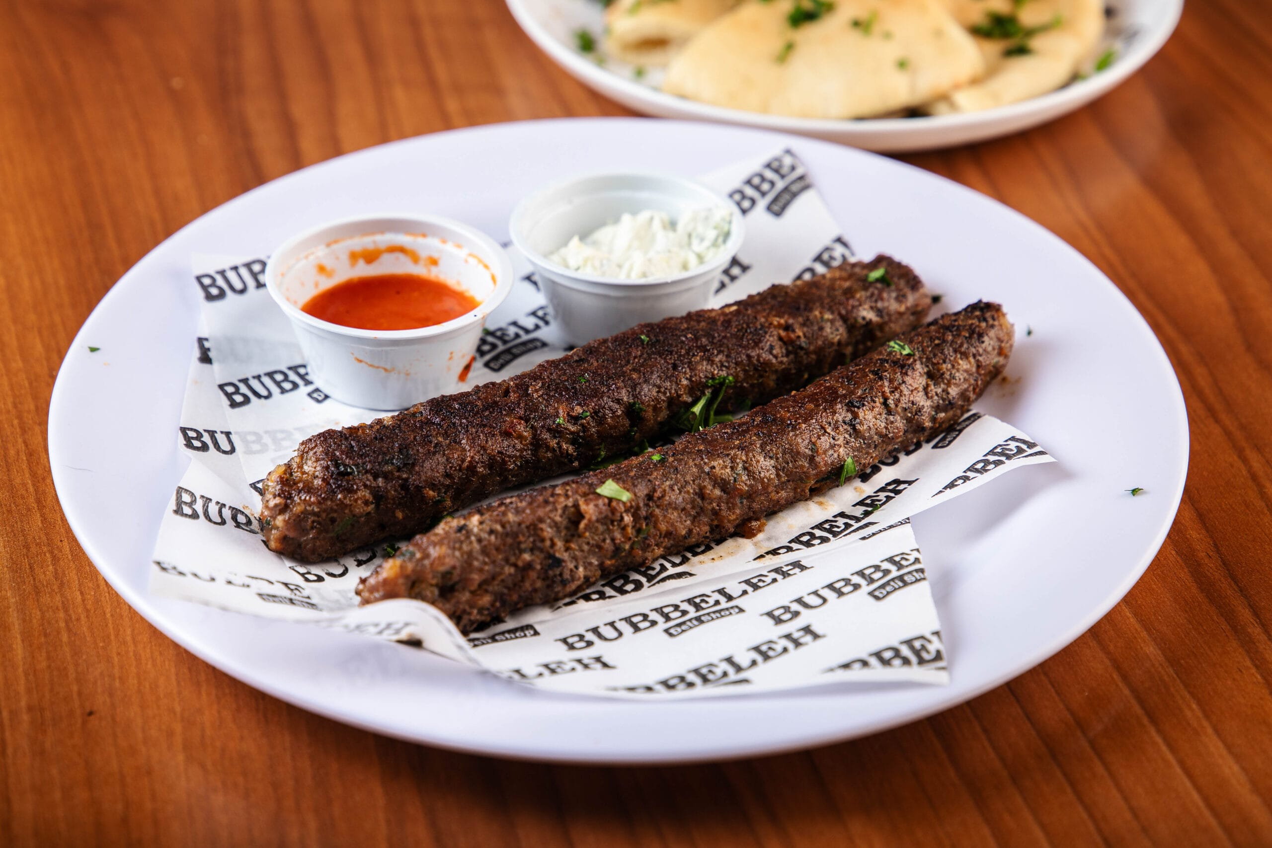 Pão pita ou folha, kebab de cordeiro, homus, tahine e salada israelense (tomate, pepino japonês, cebola roxa e salsa).