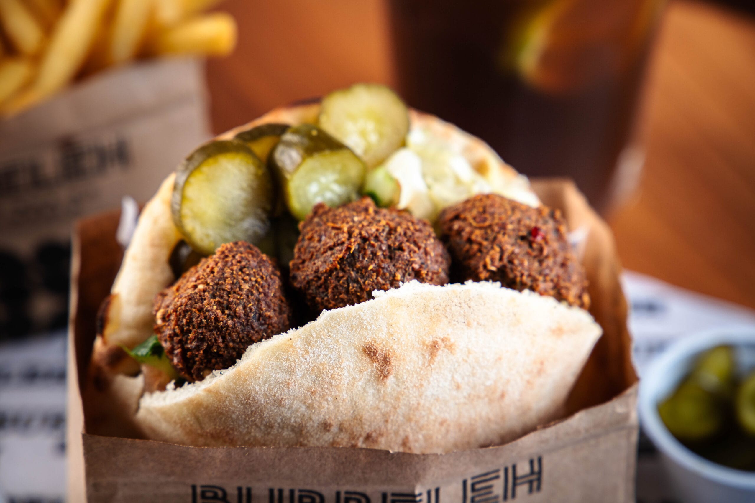 Lanche de Falafel, no pão pita ou folha, 8 bolinhos de falafel, homus, tahine, salada israelense (tomate, pepino japonês, cebola roxa e salsa), picles e repolho.